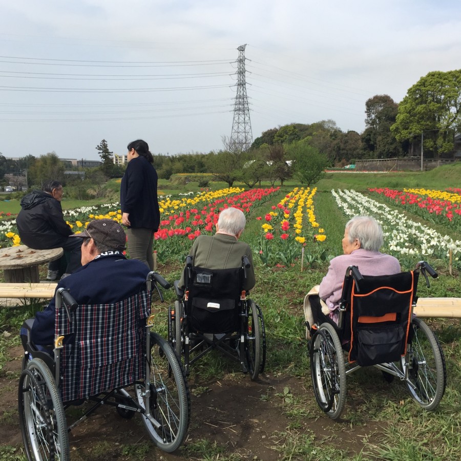 昨日はご利用者の皆さんと職員一同で、チューリップ見学に出かけました。デイサービスから5分程の場所にある「岡原花公園」(^ ^)