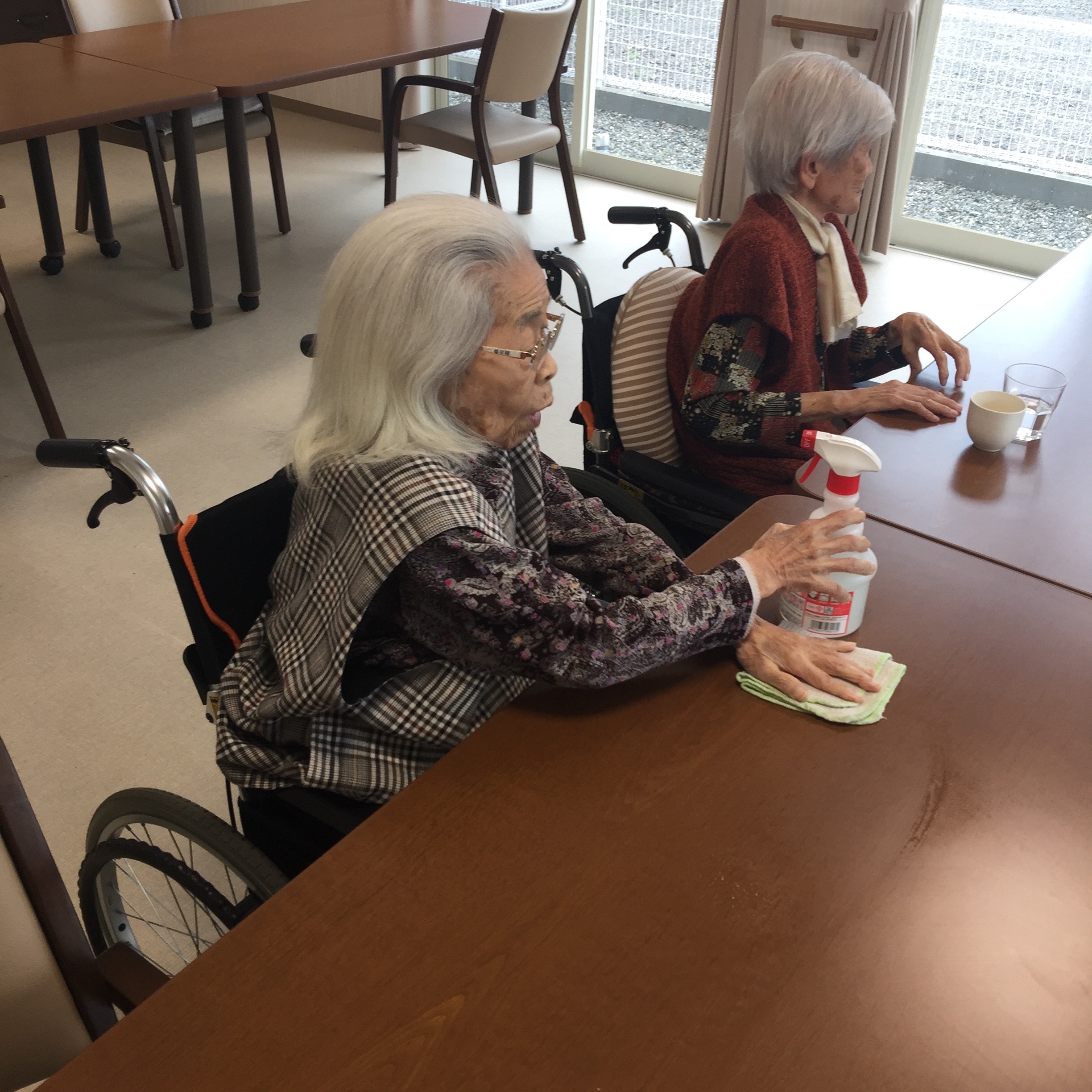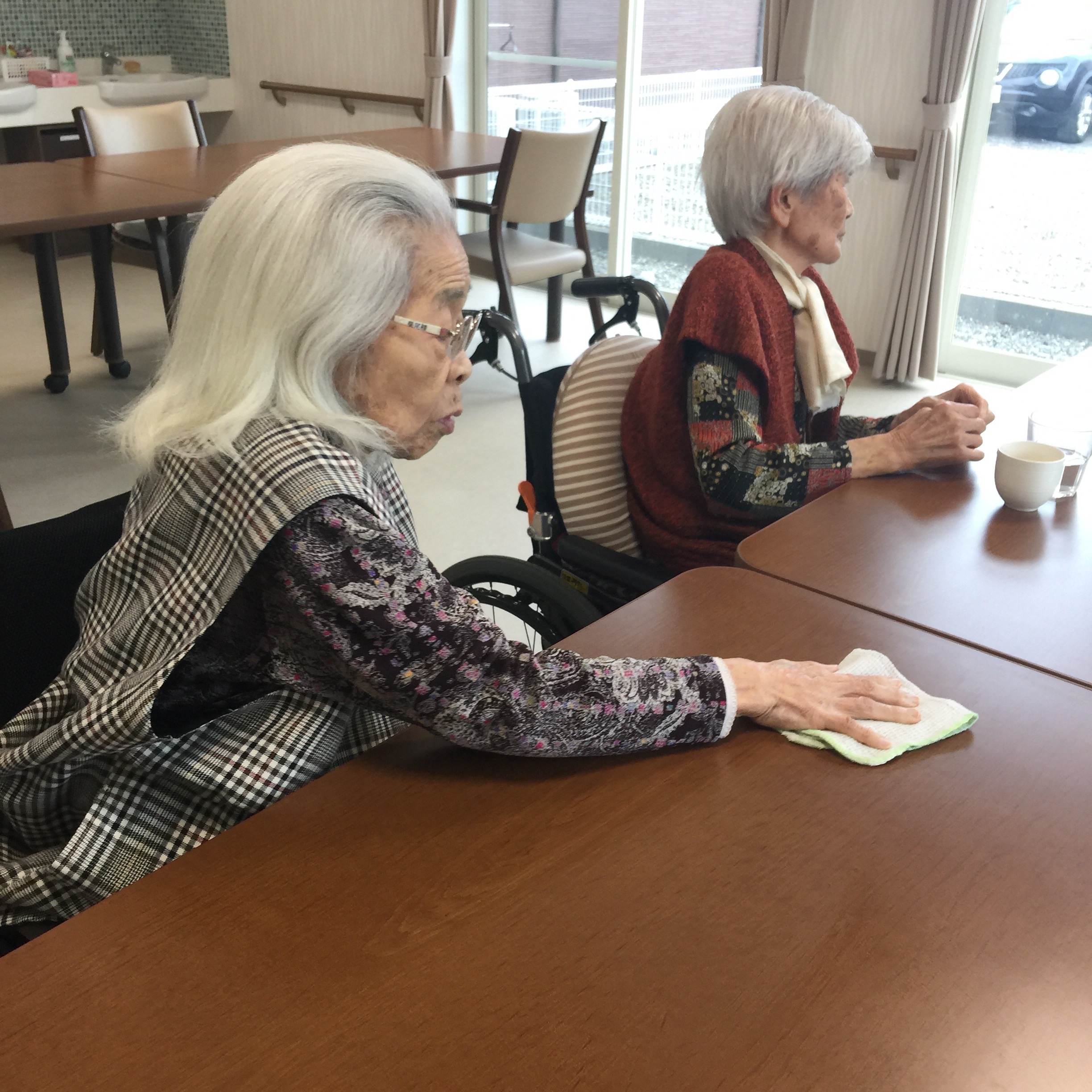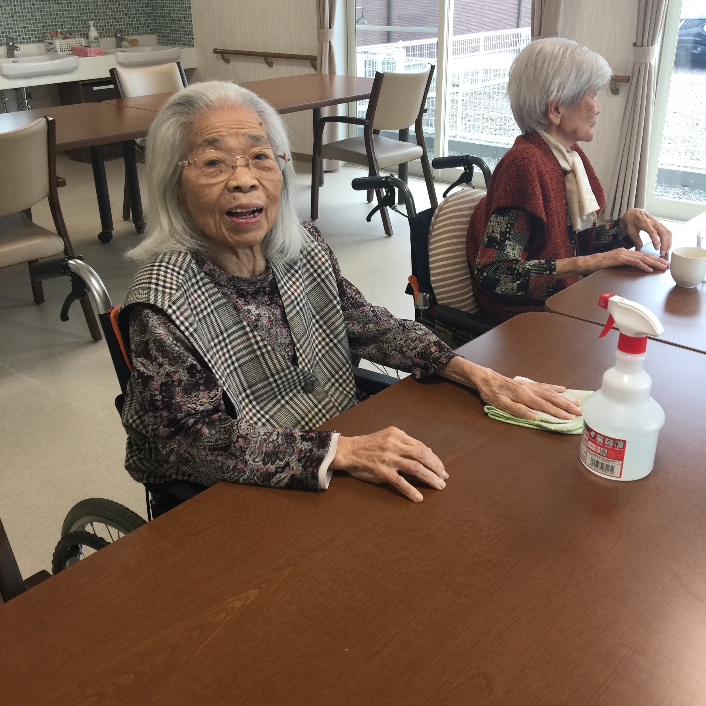 食後は職員がテーブルを消毒し、拭きあげることが多いのですが…こんなににこやかに拭いてくださるなら、たまにお願いするのも良いかもしれませんね(^-^)