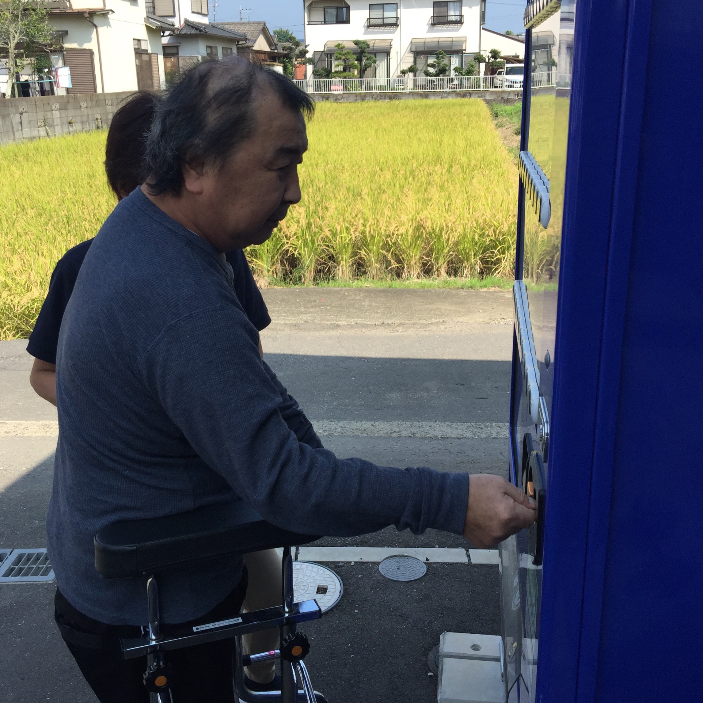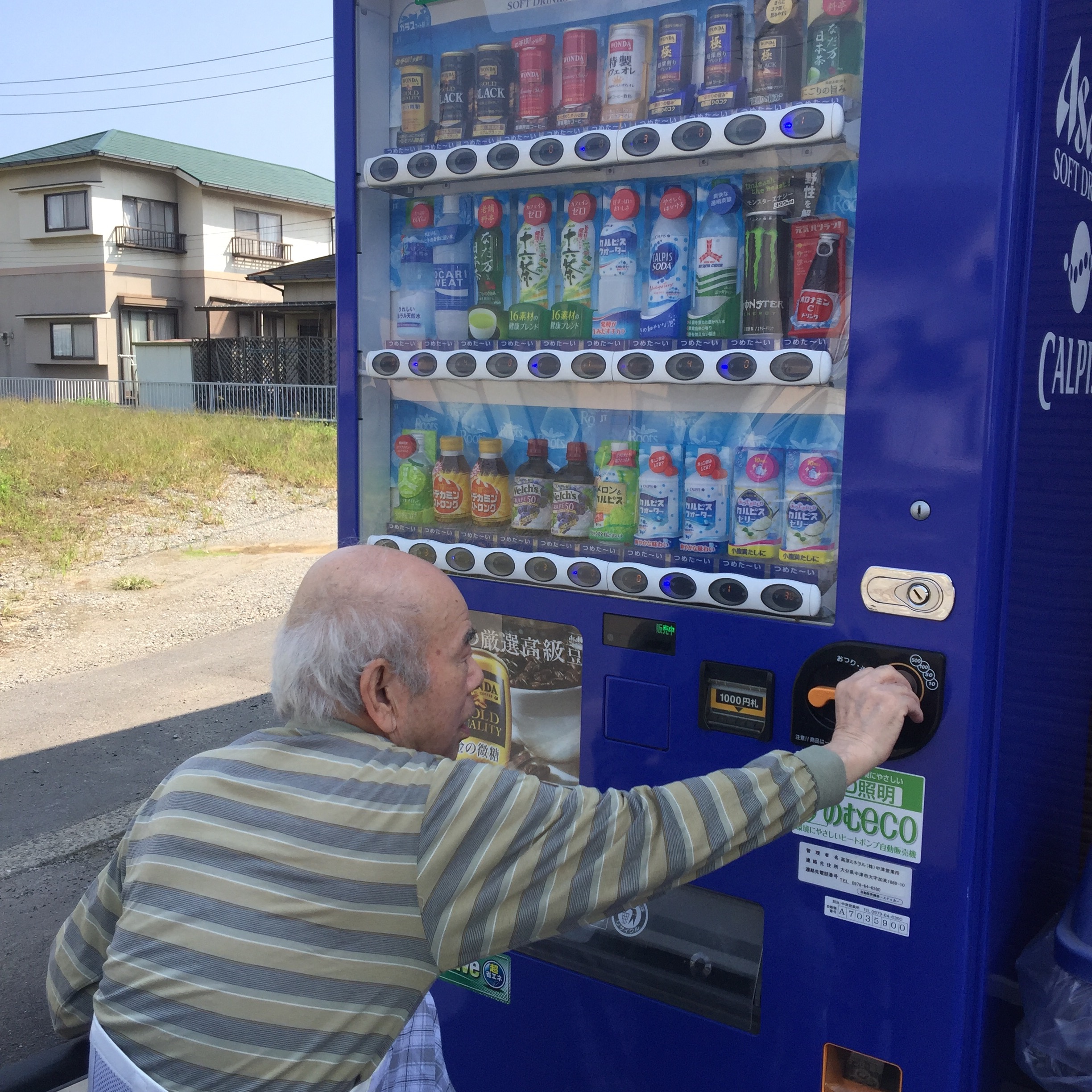 午前中の食堂にて、なにやら男性ご利用者様がお集まり。「コーヒーが飲みたいけん、買いに行く!」とおっしゃり、玄関前の自動販売機までご一緒しました。