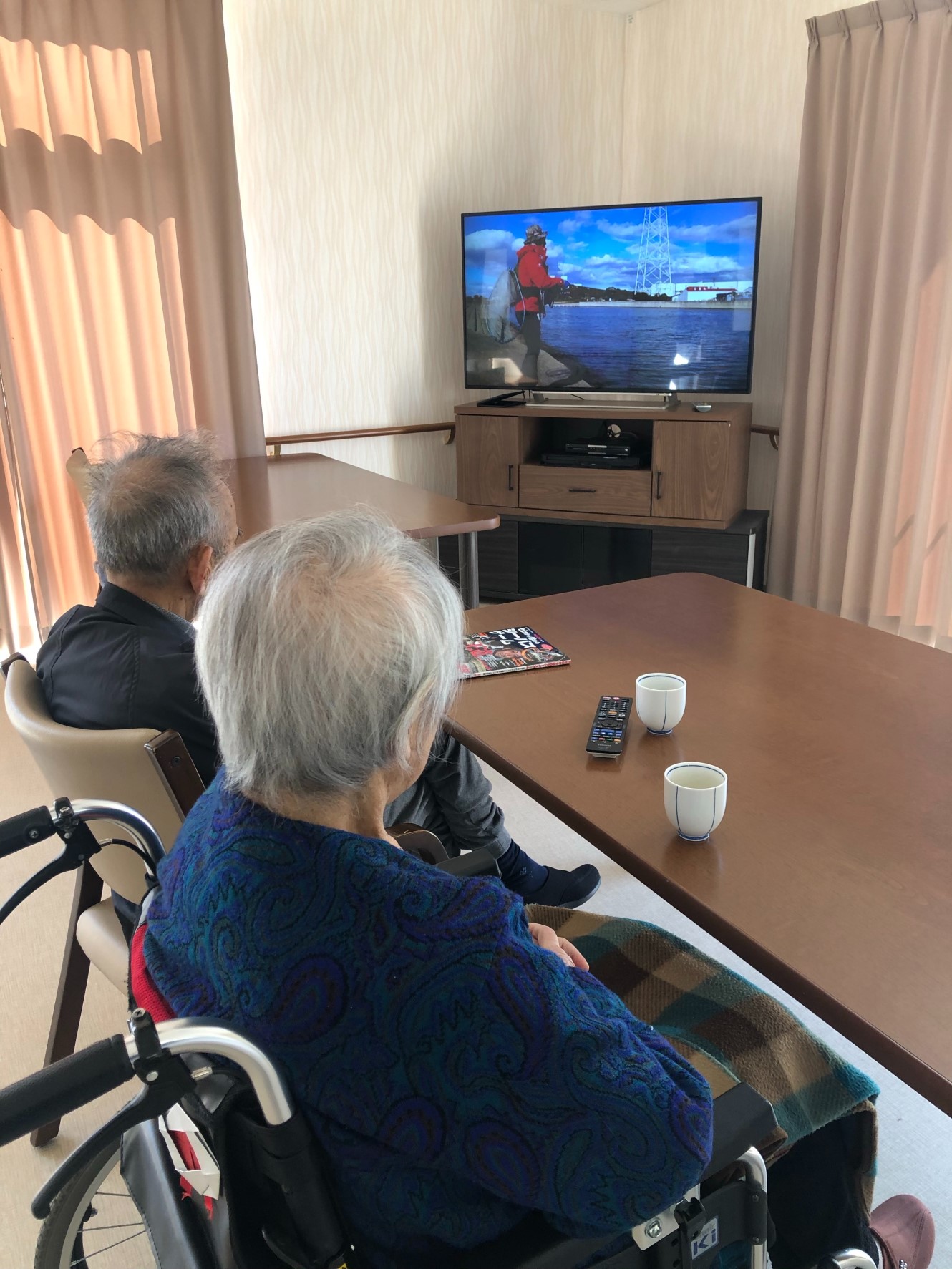 常行での余暇時間、一生懸命ぬり絵をされている方や日光浴をされている方、趣味だった釣りの映像を鑑賞されてる方・・・ゆっくりと余暇を過ごされています。