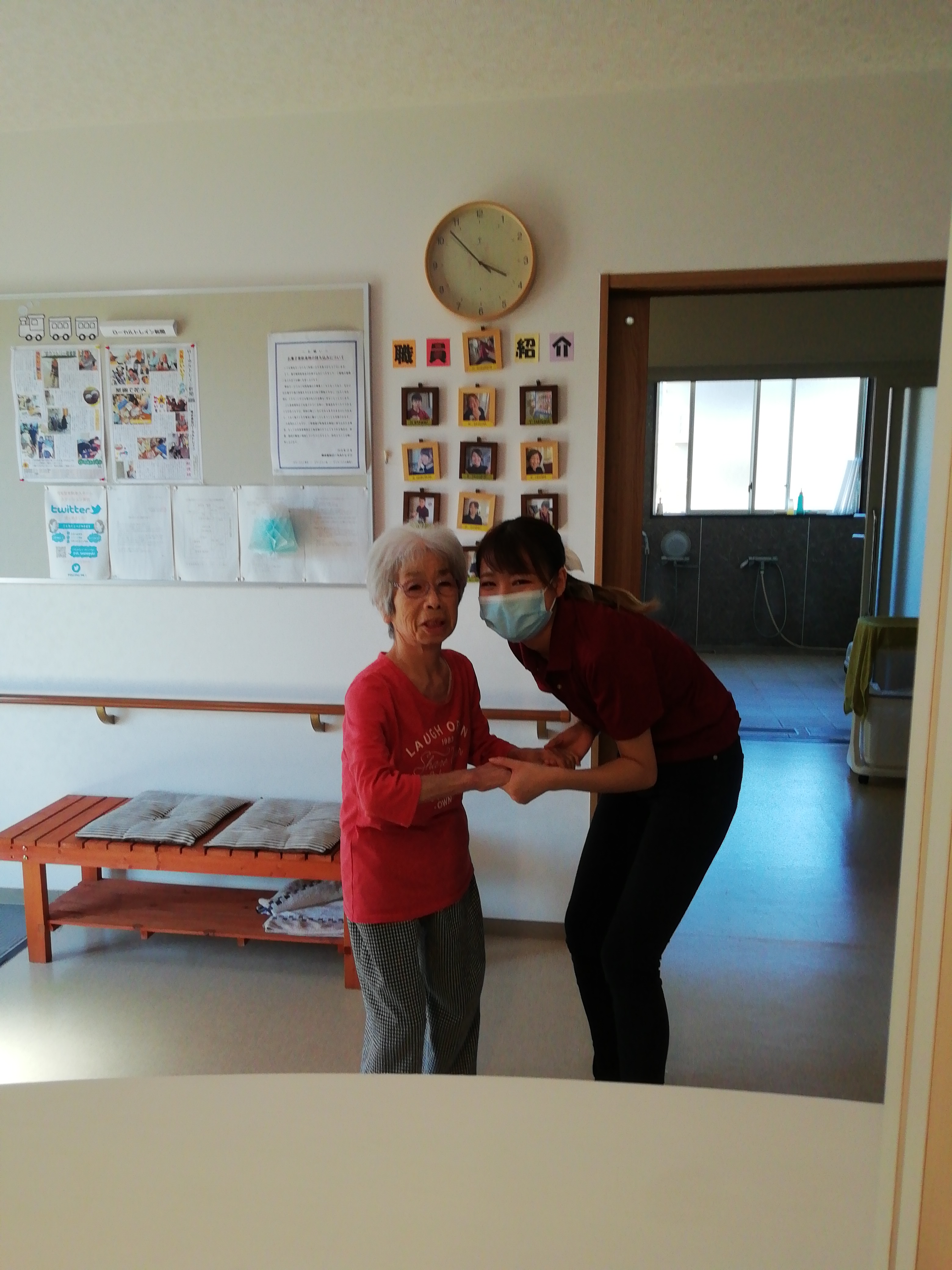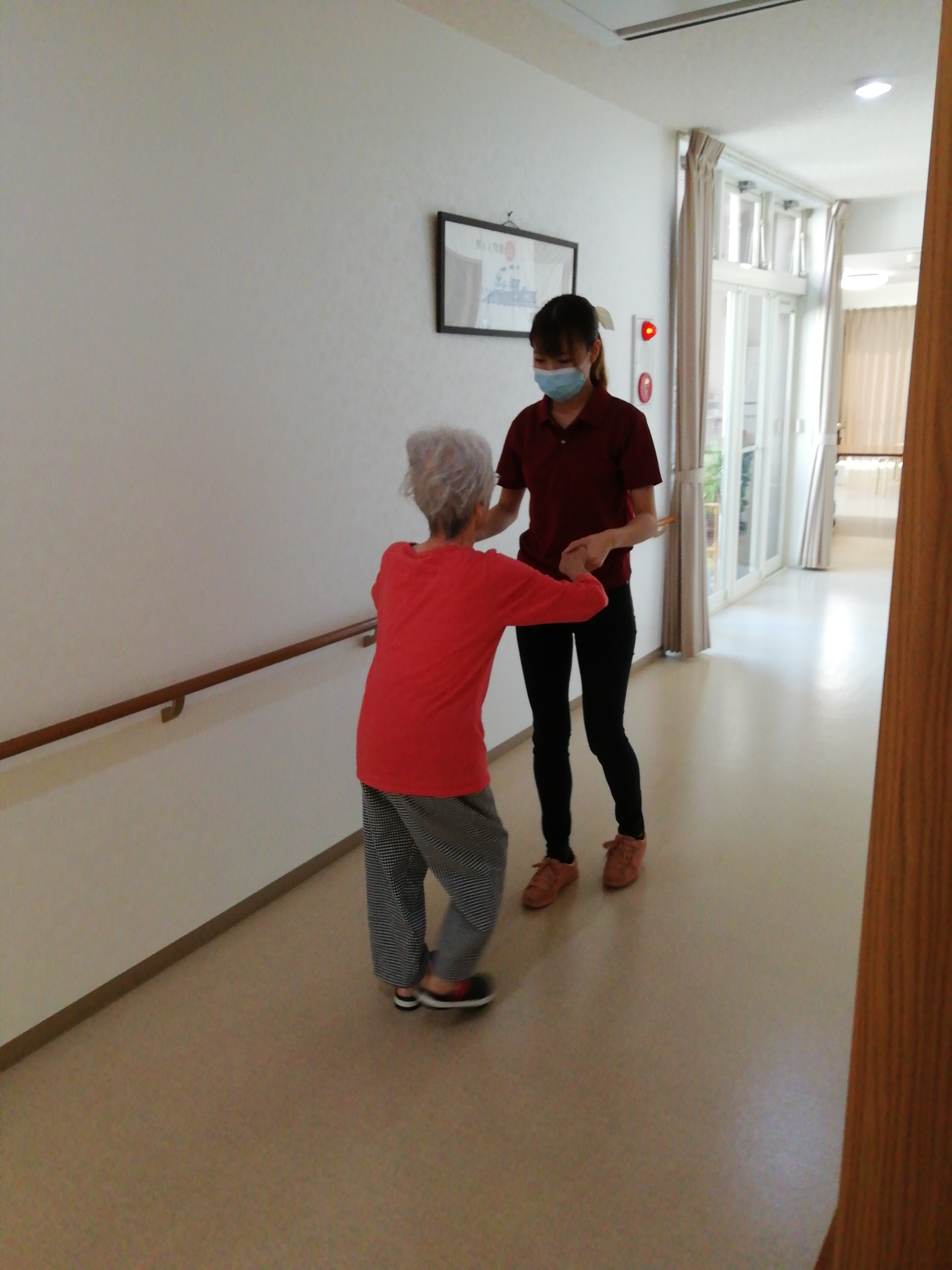 ある日の夕方、リハビリがてらに食堂まで歩いて行きました。途中、玄関の椅子で一休み&談笑を楽しんだあと、「さぁ、歩くで。」との利用者様の声に職員も重い腰を上げ、食堂まで歩かれました。