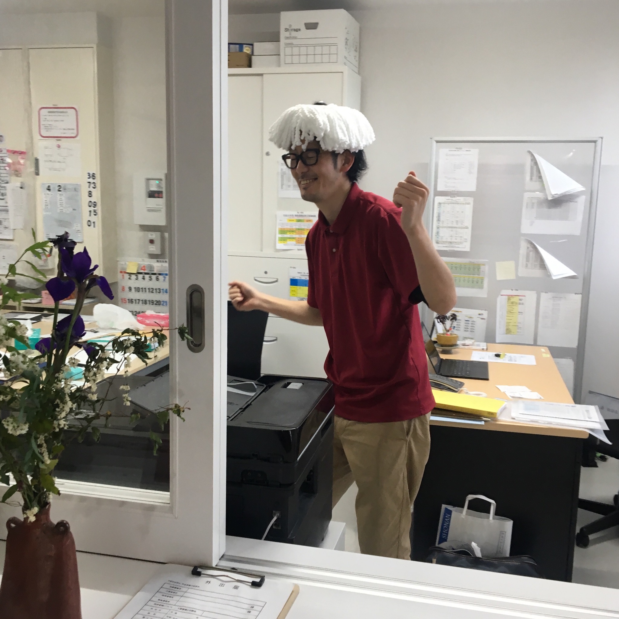 新品のモップを頭に被る社長の姿を見て大笑いおでこに葉っぱを付けてる社長の姿を見て大笑い
