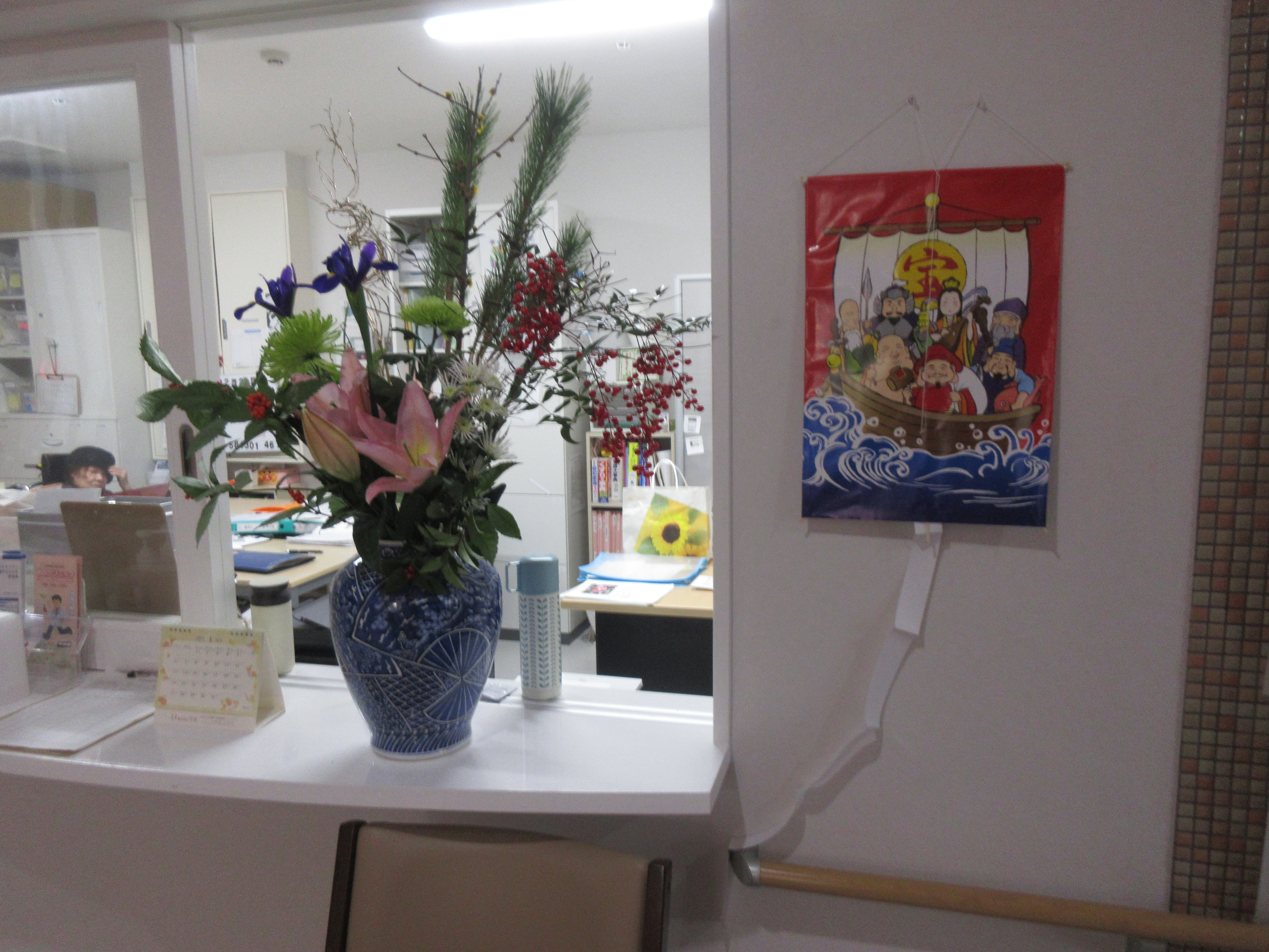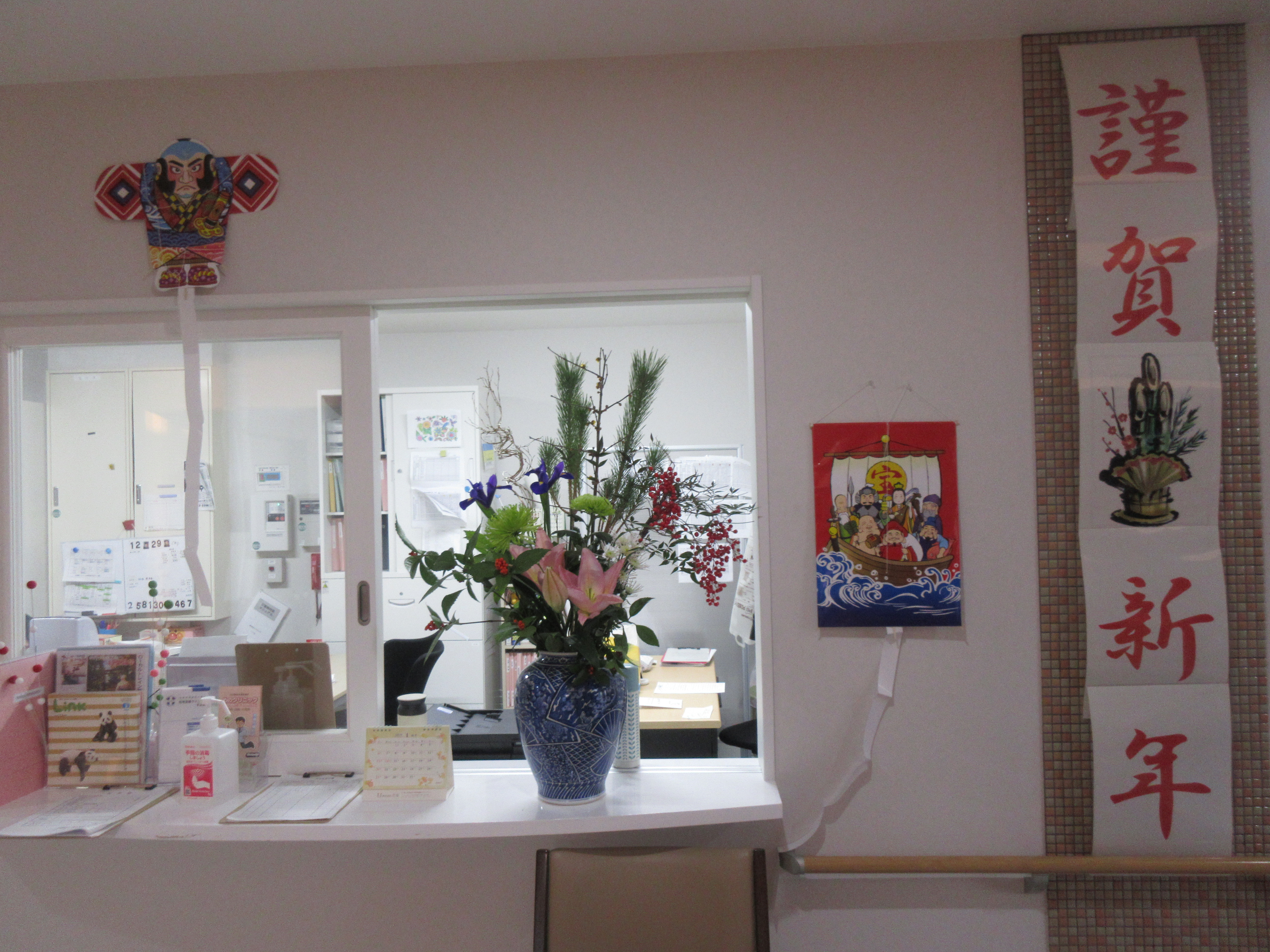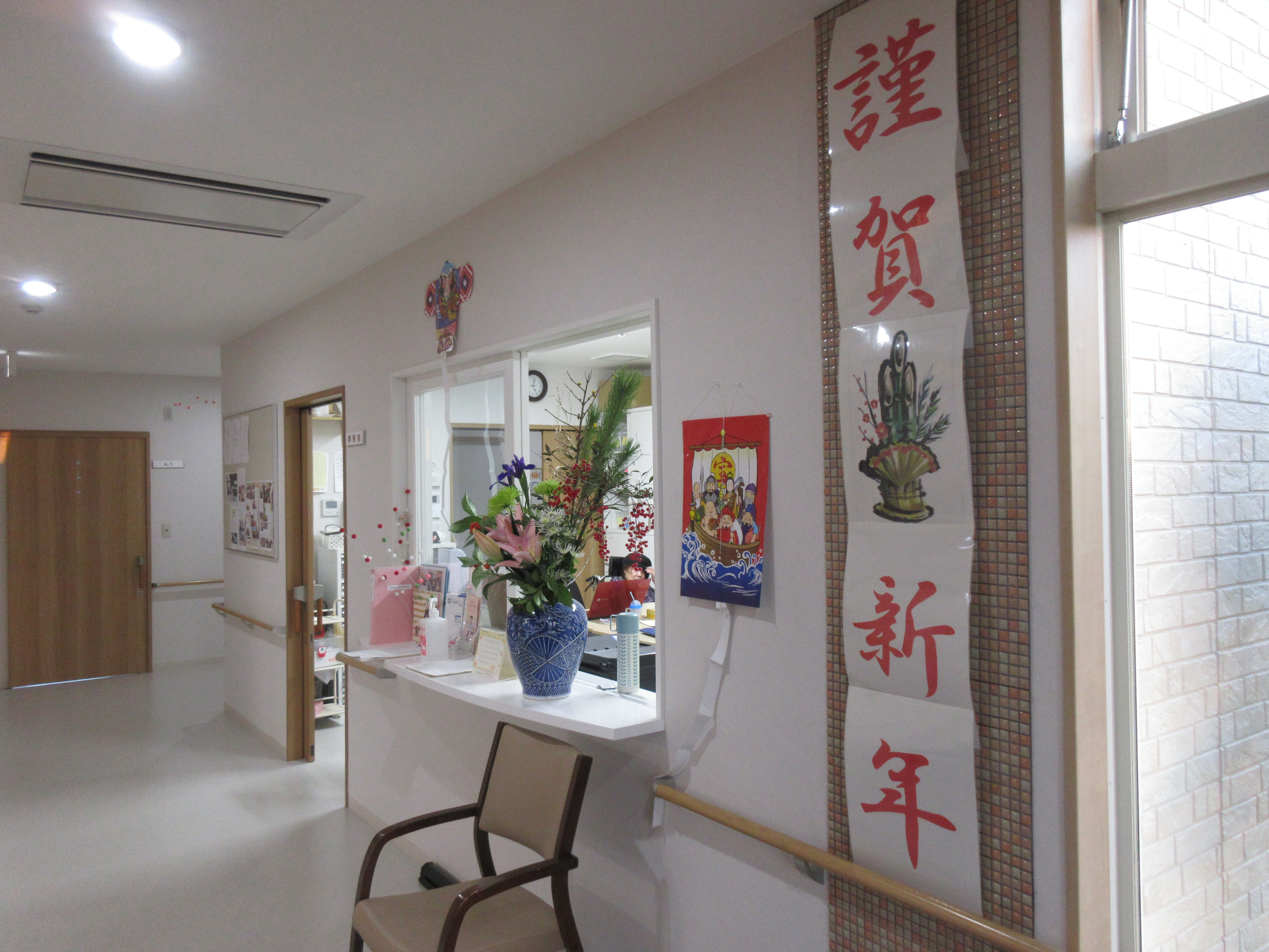 新年あけましておめでとうございます。ステーション迫にも護国神社に負けないくらいの縁起物の巨大な謹賀新年ポスターを張らせていただき入居者の皆様、ご家族、面会に来られる方々へのお出迎えをさせていただいてます。今年も新しいことへのチャレンジをしながら入居者様、ご家族様に笑顔をもたらすことを目標に「万里一空」の所存で職員一同、日々の業務に取り組んでまいりたいと思います。