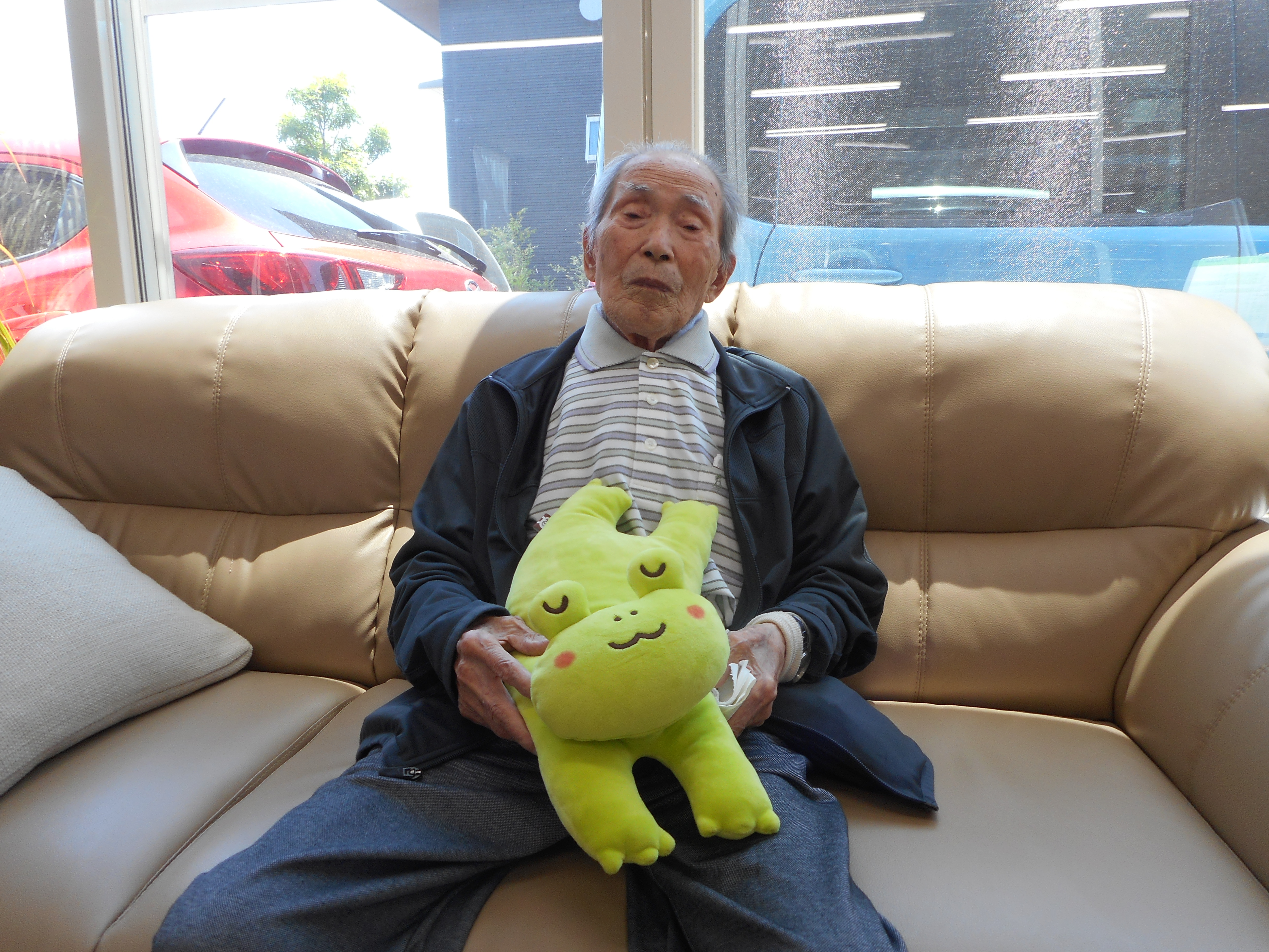 ある利用者様は、かえるのぬいぐるみを気に入ってくださっています。ご自宅にいるぬいぐるみと似ていたりして??? よく頭をなでてくださるので、かえるもぬいぐるみ冥利に尽きますね★