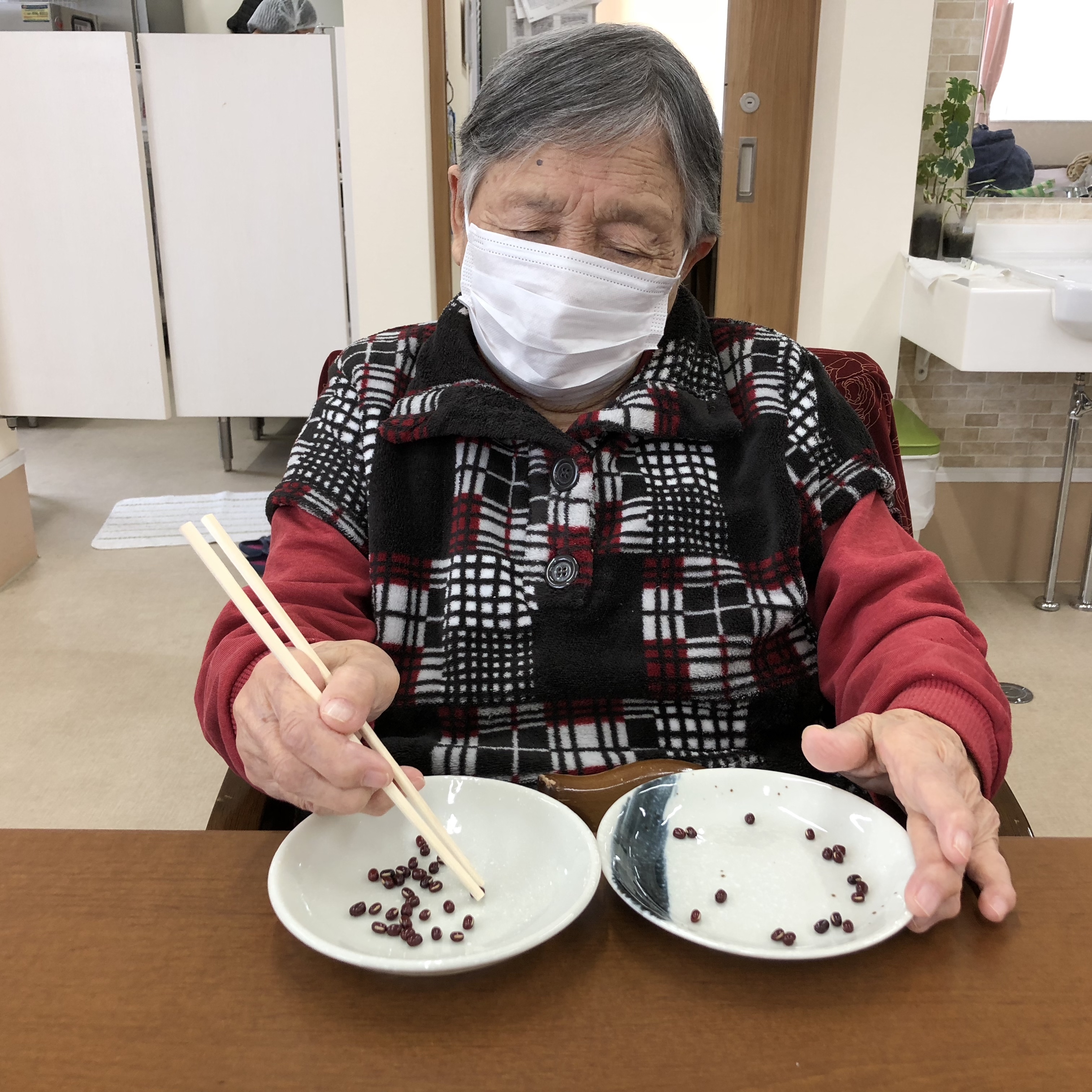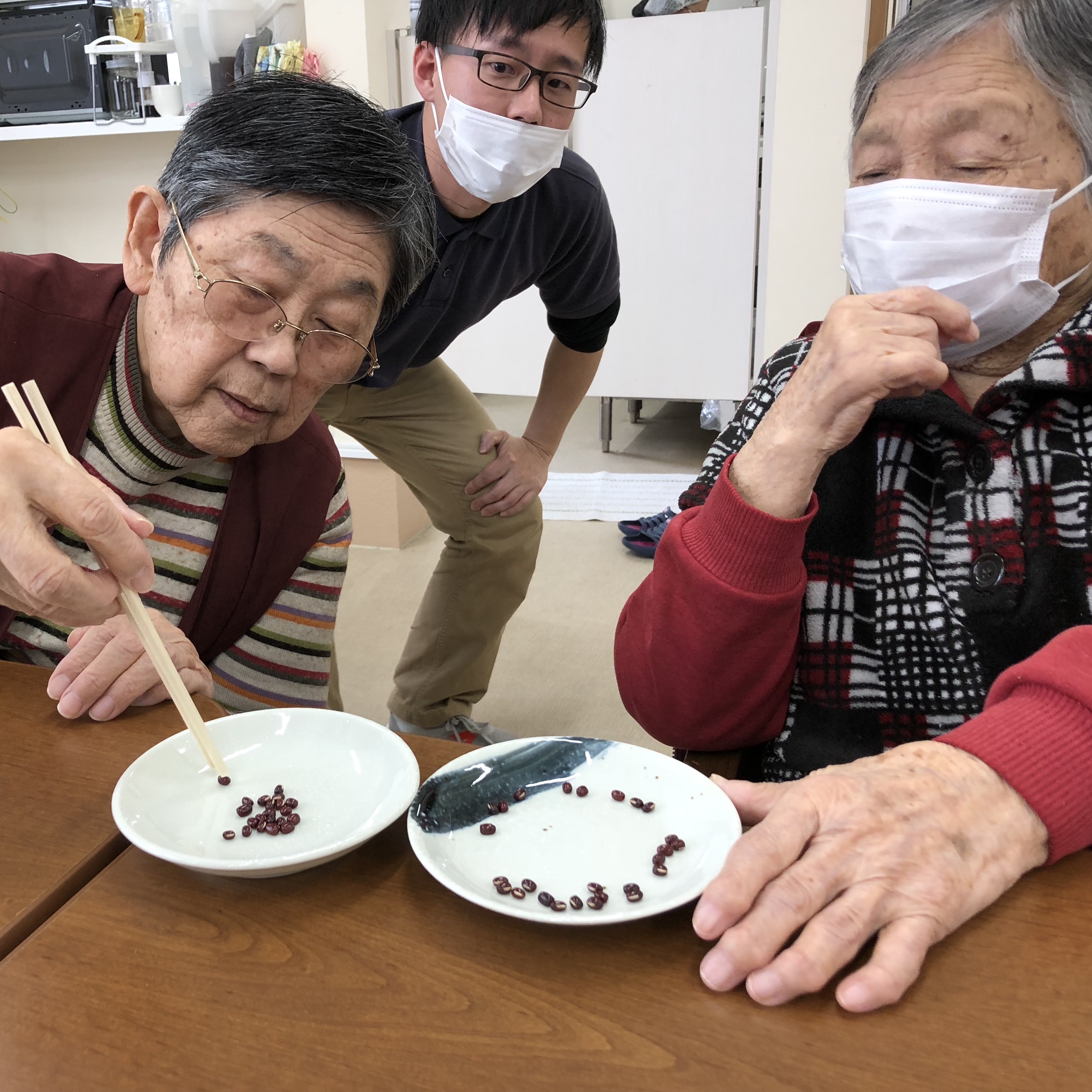 ゆったりとした時間に、豆つかみトレーニングとして、小豆をお箸で移動してもらいました。やる内容は単純ですが、小さな豆を箸でつかみ、落とさずに移動させる作業はなかなか難しいことです。脳を刺激させ、認知症予防にもつながります!