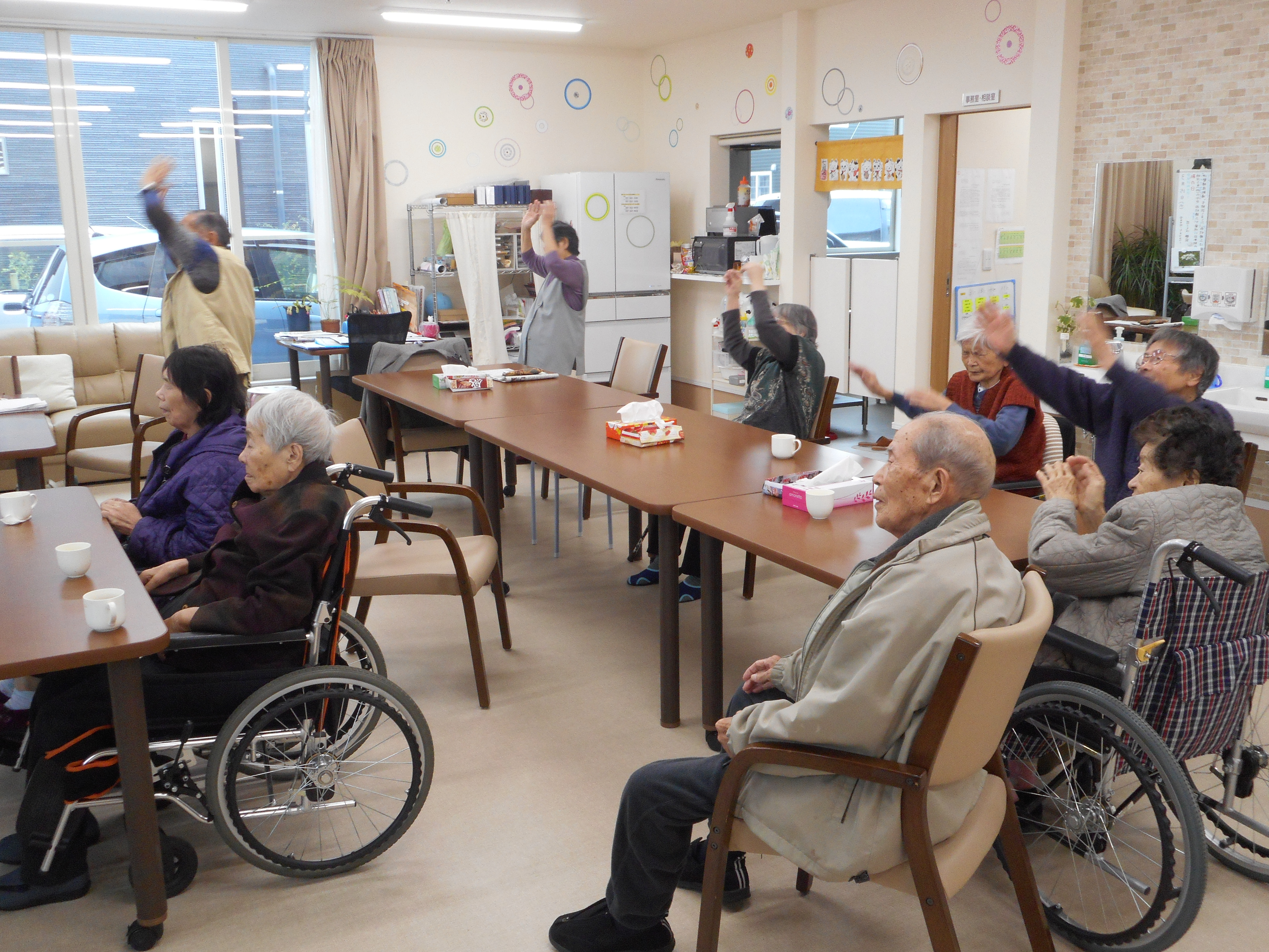 こんにちは★ デイサービス公園通りです! 今日は午後から風が強かったですね(^^: 当施設は海抜100m超の高台にあります。 ちょうど夕方の送迎車へ乗っていただく時間にビュー!と強めの風が吹き、その風をもろに前方から受けてしまった利用者様が「さみーわぇー!」と、上着をギューッと羽織り込んでいらっしゃいました。 そんな具合で、まだちょっとこのあたりは寒いので、外出レクリエーションまで、もう少し時間を頂戴いたします。楽しみにしてくださっている皆様、申し訳ございません(>_<) さて、今日の写真は午前中の体操です♪ お顔が真剣…!!
