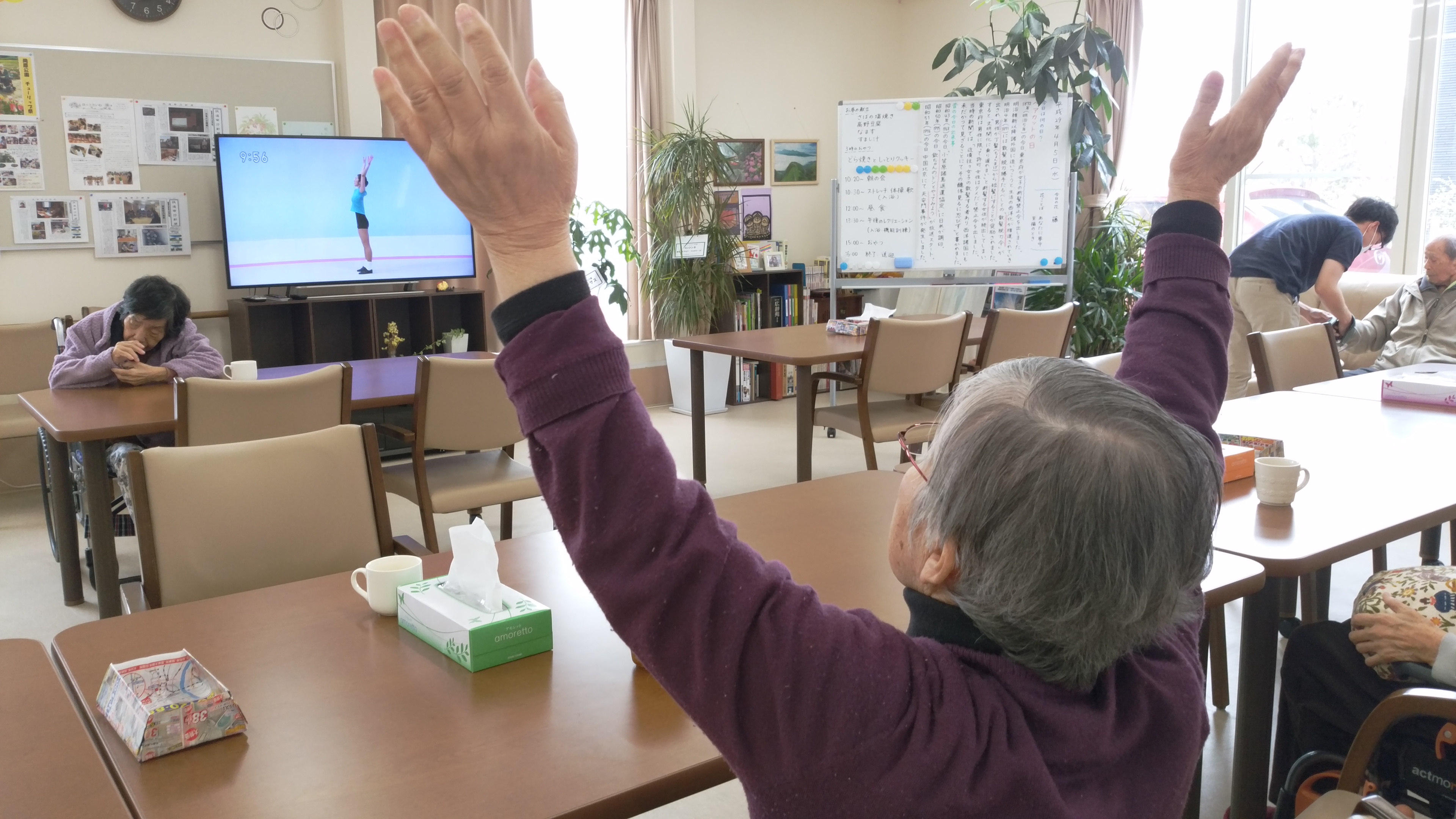 早い便で到着して、おあとの方々を待っている間、軽くテレビ体操です。
