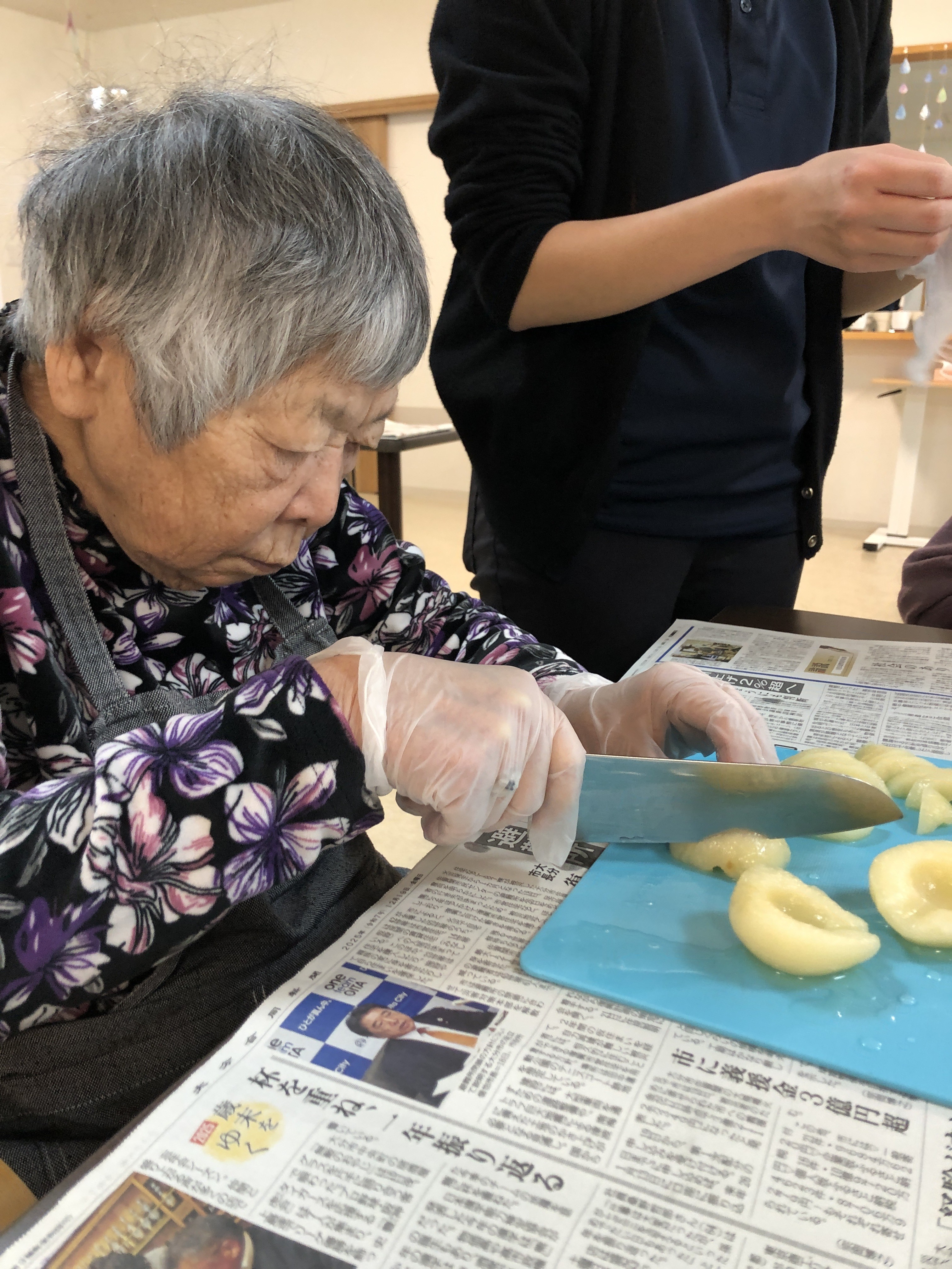 こんにちはデイサービス迫です(^^♪ 11月のおやつは「アップルパイ」を作りました♪🍎 切っている時はジューシーな香り、温めると酸味が消えた甘~い香り♪ 作っている時から楽しめるおやつでした☺♡ りんごのコンポートを餃子…