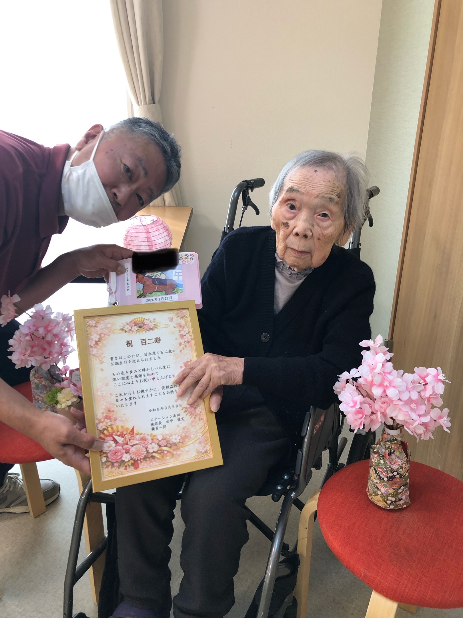 こんにちは、ステーション高田です😊 当事業所で一番の大先輩、3月29日で102歳を迎えられたご入居者様✨ ご家族様、担当ケアマネージャー様等集まっていただいた際に、表彰状の贈呈をさせていただきました! これからもお元気に…